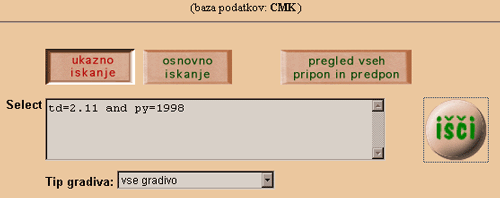 Spodaj je prikazana ukazna vrstica, s katero poizvedujemo po Prešernovih raziskovalnih nalogah MF, ki so izšle v dolocenem letu. Uporabljeno je ukazno iskanje v WWW uporabniškem vmesniku, na katerega pridete preko vstopne COBISS strani ali pa kar direktno v bazo CMK